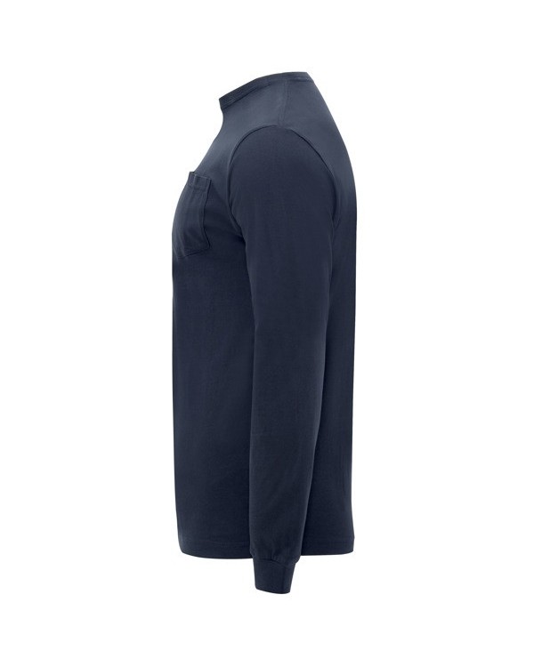 Design: Long sleeves, round neck, 1x1 ribbed cuffs, left chest pocket, reinforced cover seams on neck and shoulders.