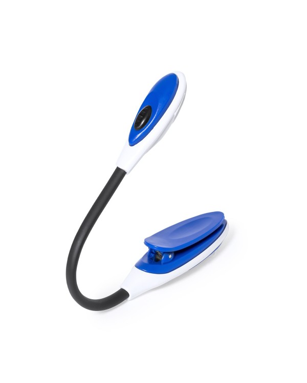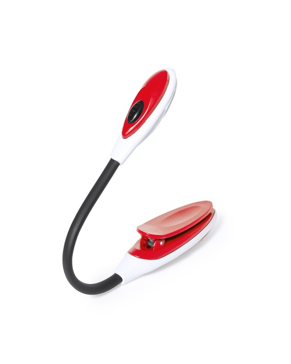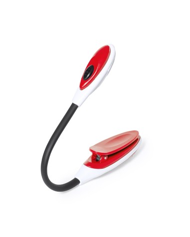 Small reading lamp with a clip for direct attachment to the book; and with a flexible body that allows the direction of the light to be changed. Ideal for travelling and on public transport. Personalisable with your logo for merchandising and corporate gifts.
