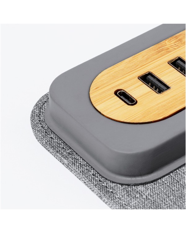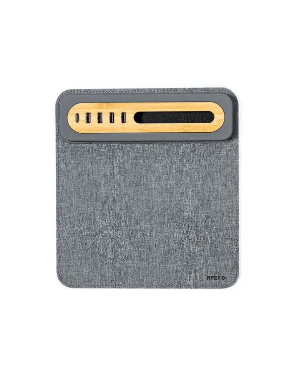 The Craig Multifunctional Mouse Pad is the ideal solution for a modern and eco-friendly workspace. Made from recycled RPET polyester and bamboo, this mouse pad combines sustainability with functionality in its design. With a Type-C port and four USB 2.0 ports , it allows you to connect and charge multiple devices at the same time, keeping your space tidy and efficient. In addition, it includes a smartphone holder and a non-slip base , ensuring comfort and stability while you work. It is a versatile and practical product that will transform your desk.