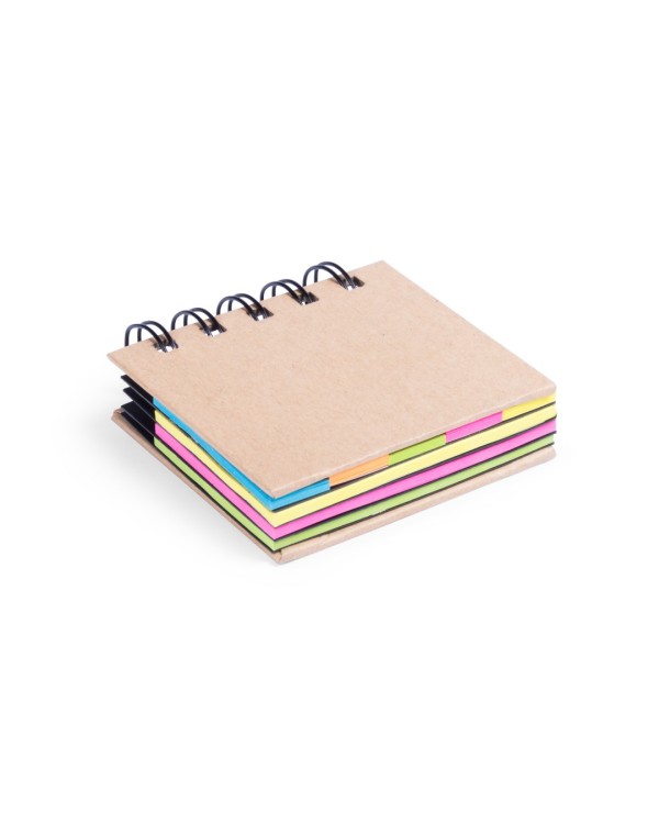 The Laska Notepad with rigid recycled cardboard covers, has 75 large sticky notes (5 x 7.5 cm) and 125 mini sticky notes (1.5 x 5 cm). Its ring design makes it easy to use and organize. Perfect for personalizing with your company logo, offering a practical and ecological option for your corporate and merchandising gifts.