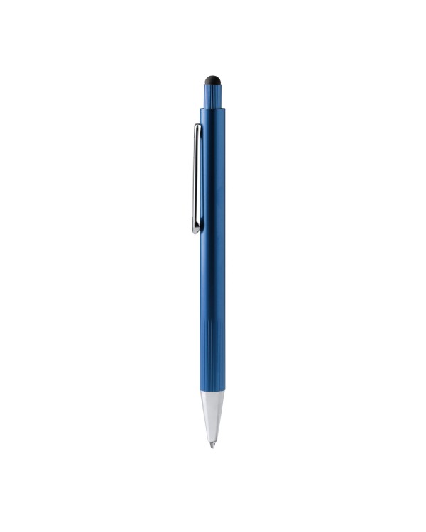 Aluminium ballpoint pen with striped grip, touch stylus and jumbo blue ink refill. Personalisable with logo by pad printing or laser engraving. Ideal for advertising and corporate gifts.