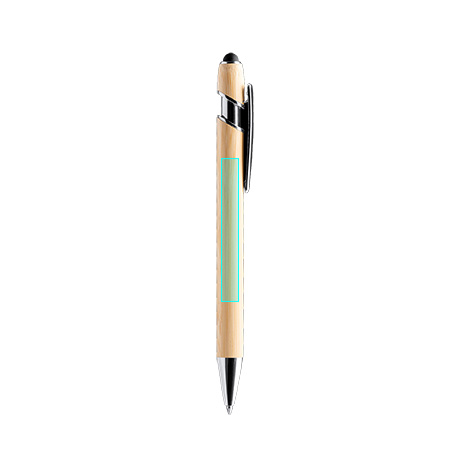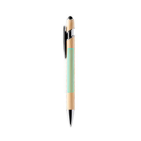 Customizable bamboo pen with metal push button and stylus. Blue ink.