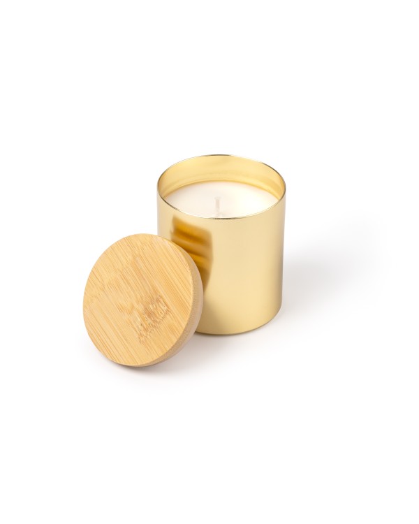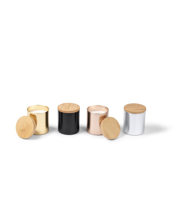 Customizable scented candle with a bamboo lid and a metallic-finished aluminum container. Vanilla scent, presented in a kraft paper box. Perfect for merchandising and corporate promotions.