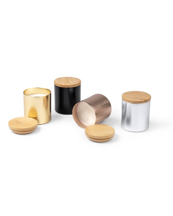 The Maris scented candle is an elegant and stylish gift, ideal for personalizing with your logo and using in marketing campaigns , merchandising , and corporate gifts . Presented in a sophisticated aluminum container with a metallic finish and a natural bamboo lid , this candle gives off a pleasant vanilla aroma that invites calm and well-being.