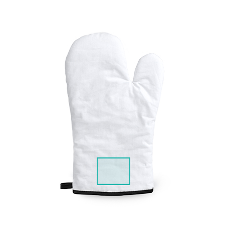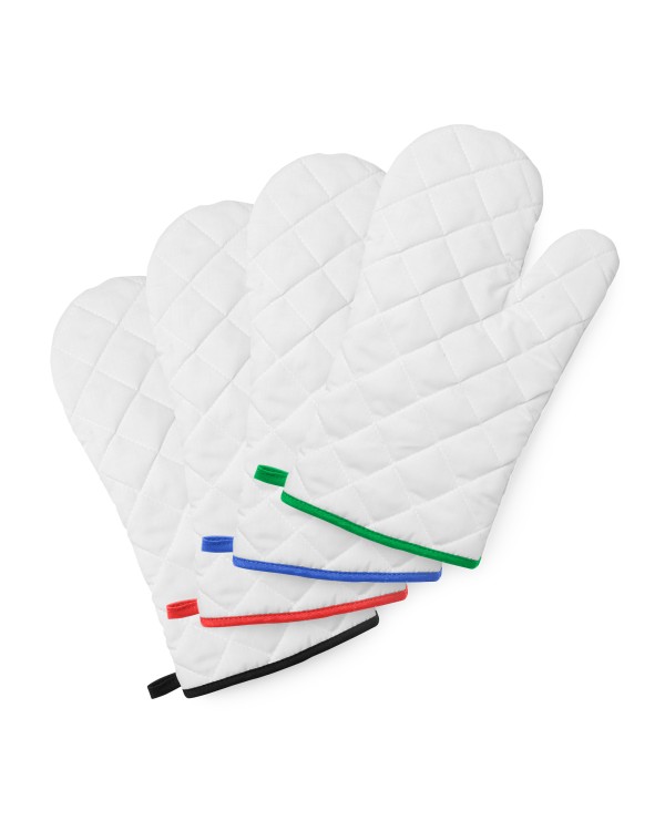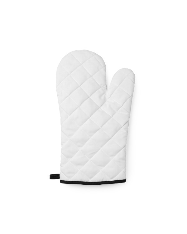 Customizable oven mitt in white polyester with colored details. The side is suitable for full-color sublimation. Ideal for promotional gifts and advertising.