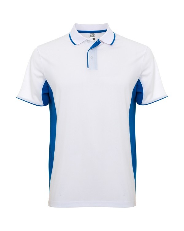 Roly Montmeló technical polo shirt , 100% polyester piqué , breathable and quick-drying. Two-tone design with a button-down collar and contrasting placket. Customizable with your logo for sports and corporate image.