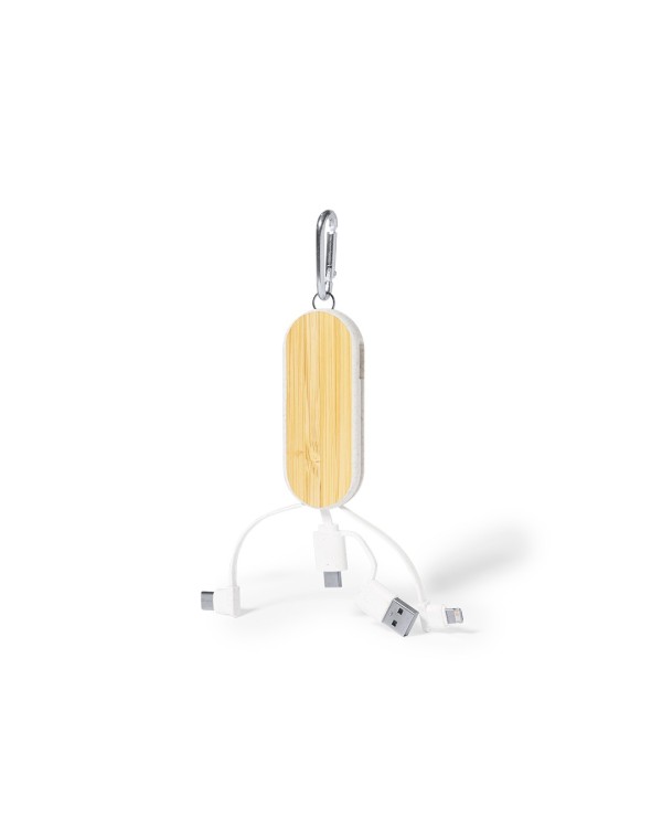 The Abby Charger Cable made of wheat and bamboo fiber, has multiple connections (Type C, USB, Lightning and Micro USB) and a practical carabiner for carrying. Ideal for transferring data and charging your devices at a speed of 5V DC 2A. This charger is ideal as an advertising gift, merchandising or business promotion.