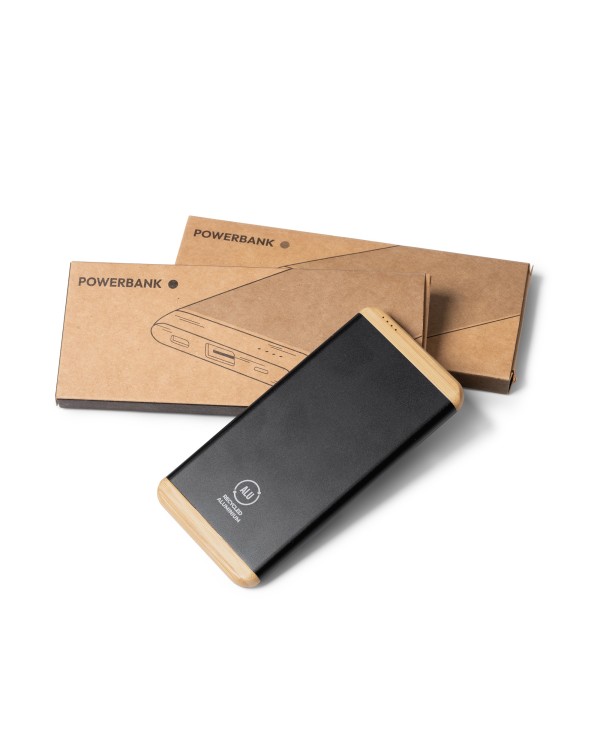 5,000 mAh external battery made of recycled aluminum and bamboo, with Type-C and USB ports, indicator light, and eco-friendly packaging. Ideal for personalizing and promoting your brand.