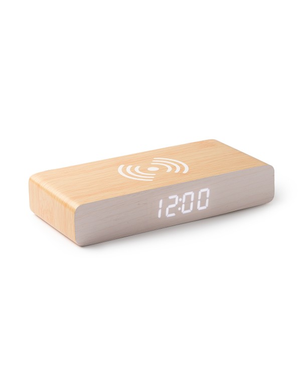 5W wireless charger made of MDF wood with a multifunction clock, alarm, date, and temperature. Customizable with logo, ideal for advertising and corporate gifts.