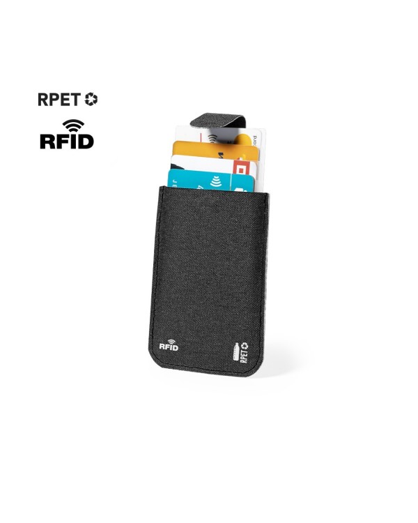 The Guarex Card Holder, made from recycled RPET polyester, helps protect the environment. It includes RFID technology to protect your personal data and capacity for 5 cards , with a magnetic closure system. Its elegant black design with RPET and RFID badges makes it a safe and sophisticated accessory. Perfect for personalizing with your logo.