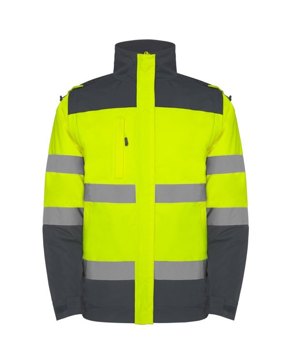 Roly's EPSYLON Padded Parka is ideal for high-visibility work. Featuring a two-tone design, reflective tape, detachable sleeves, and multiple pockets, it can be customized for corporate uniforms and promotional designs. Made of waterproof and windproof polyester, certified according to CE standards.